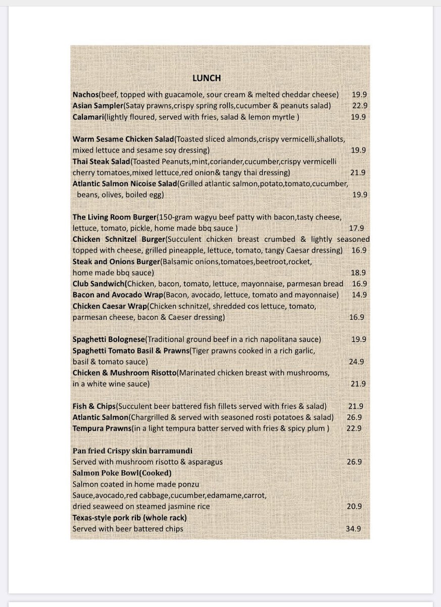 Food selections are grouped into light meals, mains, pasta and risotto, and snacks. Light meals and snacks include items such as Club Sandwich, Roma Bruschetta, and a selection of cakes. Lunch mains offer seafood, poultry, and vegetarian options, including Calamari served with fries and salad, Fish & Chips, Salmon Poke Bowl with steamed jasmine rice, and Pan Fried Crispy Skin Barramundi with mushroom risotto and asparagus.