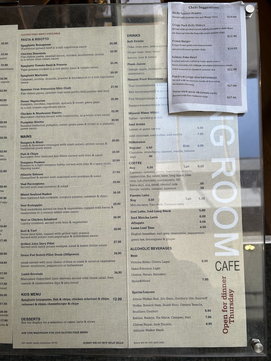 Pasta and risotto dishes include Spaghetti Bolognese, Spaghetti with Tomato, Basil & Prawns, and Chicken and Mushroom Risotto. Additionally, breakfast-style items such as Scrambled Eggs, Vegetarian Omelette, Spanish Omelette, and Bacon and Egg on Turkish bread are available.